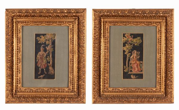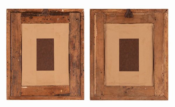 cm 17,5x8Raffiguranti falconiere e dama. Cornici romane in legno dorato a 4 ordini di intaglio, non pertinenti