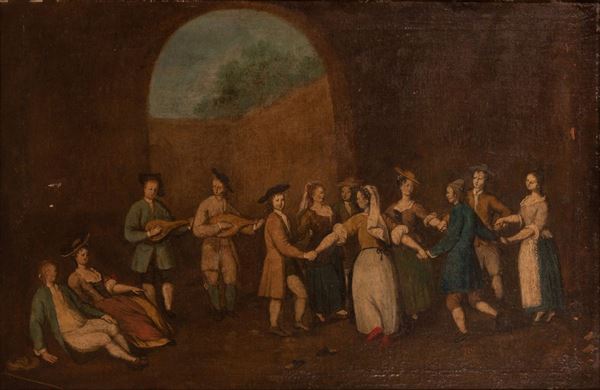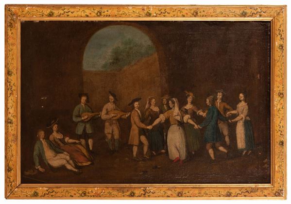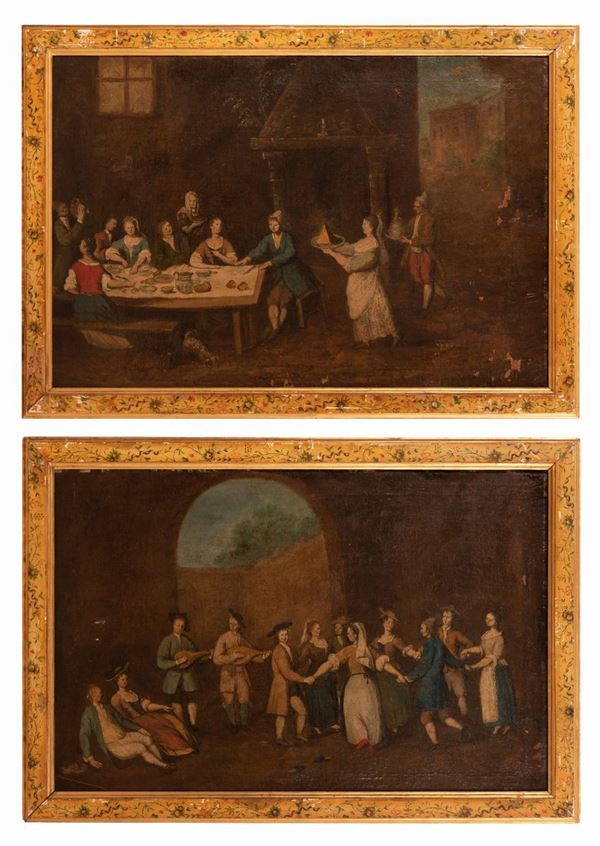 Coppia di dipinti raffiguranti "Scena di festa" e "Banchetto all'aperto"