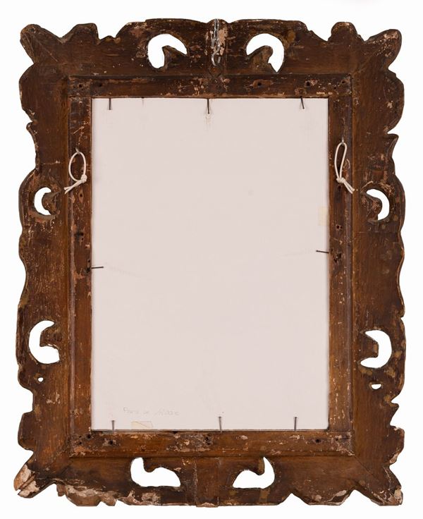 Condizioni: Bellissimo disegno a matita su carta scura, margini irregolari in seguito al distacco da vecchio montaggio, restauro professionale. Imponente cornice con mancanze e cadute.
