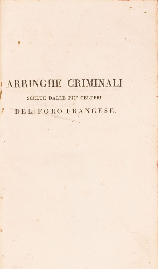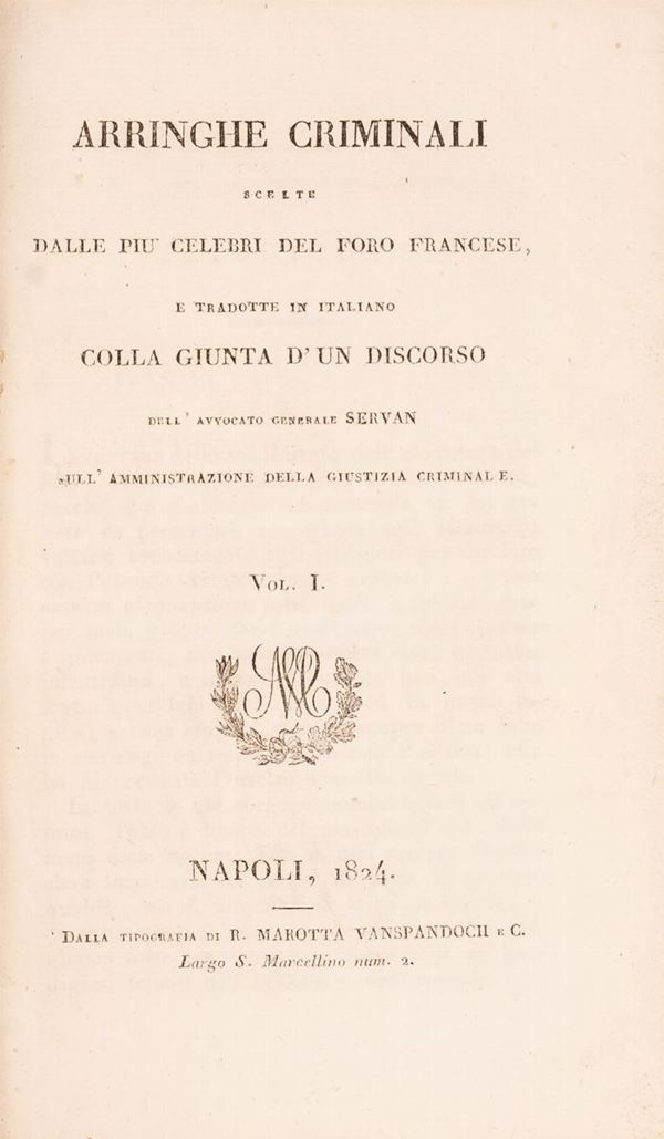 ARRINGHE CRIMINALI scelte dalle più celebri del Foro Francese colla giunta d'un discorso dell'avvocato generale Servan (Vol I e III)