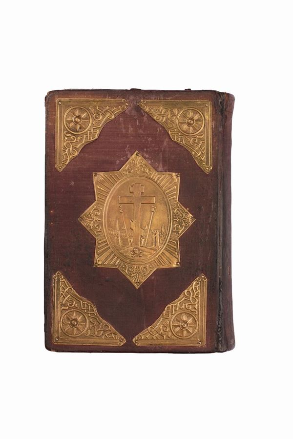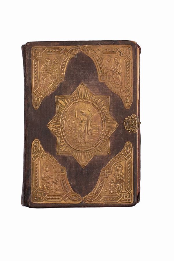 volume in ottavo in tela con inserti  in ottone dorato riccamente incisi ai due piatti , raffiguranti Gesù , la Croce e Santi.