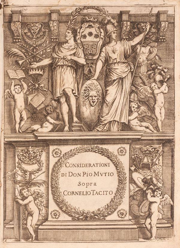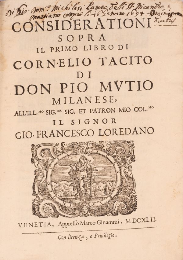 Muzio, Pio, et al., Considerazioni sopra il primo libro di Cornelio Tacito di don Pio Mutio ... - vol. I. Venetia, appresso Marco Ginammi, 1642, [60], 544 p. ; 4°.
