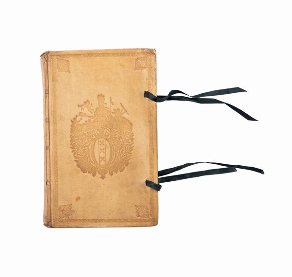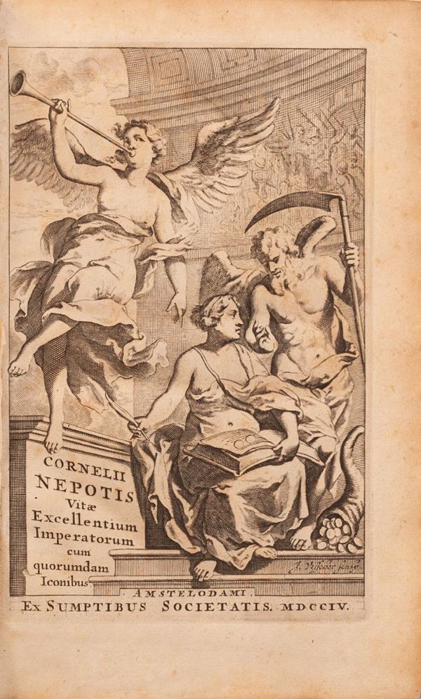 DESCRIZIONE: [32], 439, [41] p. : ill., 1 antip. ; 8º; antiporta illustrata recante però la data 1704 (fu usata più volte per edizioni di Cornelio Nepote durante il '700). Frontespizio illustrato, dedicatoria (14pp), 439, 41 pp di Rerum et Verborum. Diverse incisioni nel testo in medaglione raffiguranti imperatori, qualche macchia dovuta alla qualità della carta ma bellissima copia in legatura coeva in tutta pergamena alle armi di Amsterdam sul entrambe i piatti e agli angoli delle stesse oltre che sul dorso. Lacci di chiusura in seta blu