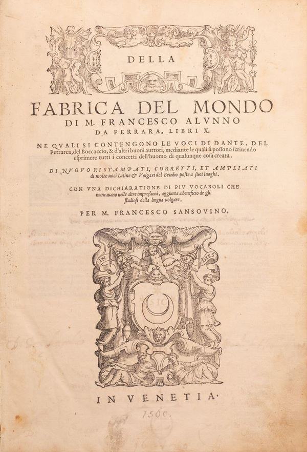 TITOLO: Della fabrica del mondo di m. Francesco Alunno da Ferrara, libri 10. Ne quali si contengono le voci di Dante, del Petrarca, del Boccaccio, & d'altri buoni auttori, ... di nuouo ristampati, corretti, et ampliati di molti uoci latine & volgari del Bembo poste a suoi luoghi. Con una dichiaratione di piu vocaboli che mancavano nelle altre impressioni, aggiunta a beneficio de gli studiosi della lingua uolgare. Per m. Francesco Sansovino