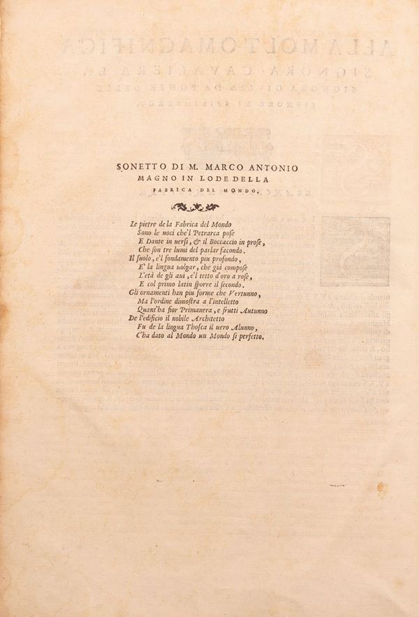 DESCRIZIONE: Frontespizio con titolo e elaborato ritratto dell'autore eseguito a silografia, note di possesso manoscritte in epoche diverse; 10 pagine non numerate di dediche; 52 pagine non numerate di indici; 237 carte numerate per il testo; al verso dell'ultima bella e grande marca tipografica (Luna crescente con le punte in alto. In cornice figurata. Motto: In dies); nel testo numerosi capolettera abitati di dimensioni diverse. Il volume è un'edizione di un'opera impressa la prima volta a Venezia nel 1546 e destinata a notevole fortuna nel corso del sedicesimo secolo. Il testo è un interessante esempio di vocabolario metodico: ciascuno dei dieci libri che lo compongono elenca le parole che riguardano una delle "dieci salde colonne" poste a fondamento del mondo (il quale è a sua volta definito come "ricco edificio" ovvero "fabrica"). Tali colonne sono: "Dio, Cielo, Mondo, Elementi, Anima, Corpo, Huomo, Qualità, Quantità & Inferno". I vocaboli sono tratti da quelli che nel Cinquecento erano ritenuti i "buoni autori" della lingua volgare, e specialmente da Dante, Petrarca, Boccaccio e Bembo: grazie a questi scrittori è infatti possibile (come si afferma nel frontespizio) "esprimere con facilità & eloquenza tutti i concetti dell'huomo di qualunque cosa creata". Il testo è preceduto da ampi indici delle voci contenute nel vocabolario e dei nomi di persone e luoghi in esso citati.