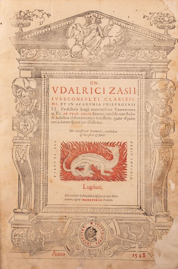 Segni di usura sui piatti e e alla cuffia inferiore, alcuni restauri ben eseguiti sul frontespizio in nero e rosso con marchio tipografico raffigurante una salamandra e con il motto "VIRTUTI SIC CEDIT INVIDIA" (così l'invidia cede alla virtù)