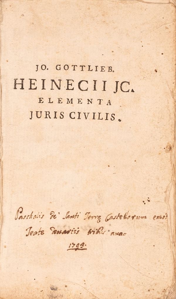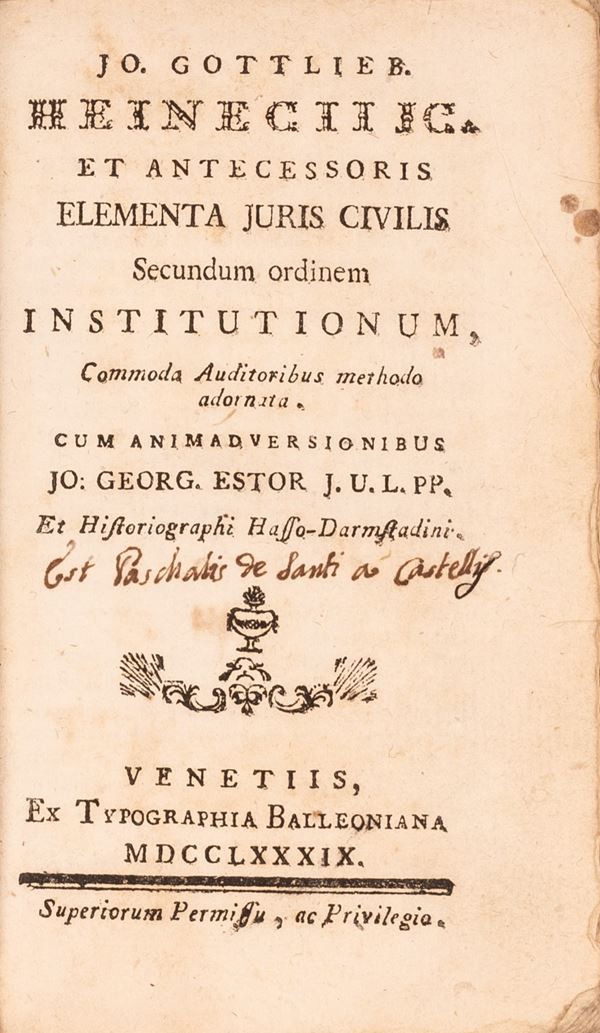 Gottlieb Heinecii, Jo. Elementa Juris Civilis Secundum Ordinem Institutionum. Venetiis: Ex Typographia Balleoniana, 1770.