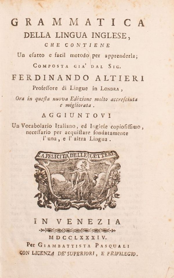 GRAMMATICA DELLA LINGUA INGLESE, CHE CONTIENE UN'ESATTO E FACIL METODO PER APPRENDERLA; COMPOSTA GIA DAL SIG. FERDINANDO ALTIERI ... ORA IN QUESTA NUOVA EDIZIONE MOLTO ACCRESCIUTA E MIGLIORATA. AGGIUNTOVI UN VOCABOLARIO ITALIANO, ED INGLESE COPIOSISSIMO . IN VENEZIA PER GIAMBATTISTA PASQUALI 1784