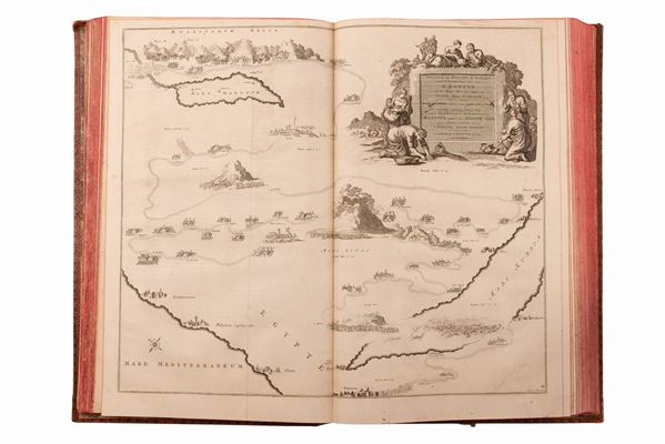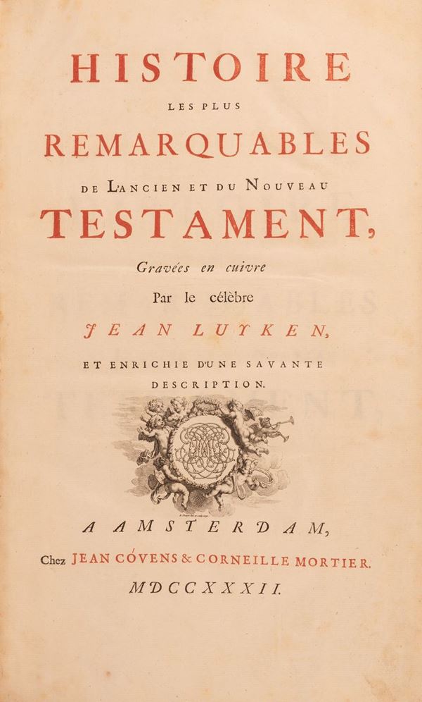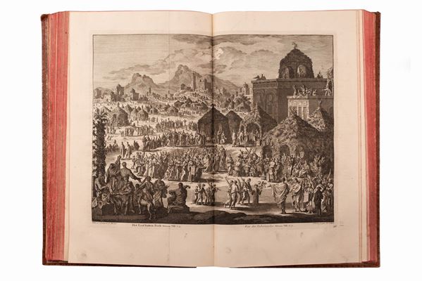 In folio, edizione figurata da 60 splendide tavole f.t. con relativa spiegazione incise finemente su lastra di rame (disposte su foglio doppio comprese alcune carte geografiche) edite da Mortier. Una delle più belle bibbie figurate stampate in Olanda all'inizio del settecento. Legatura in pelle con titoli al dorso e decorazioni a freddo sui piatti.