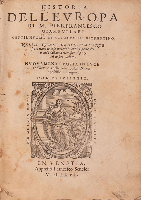 HISTORIA DELL'EUROPA DI M. PIERFRANCESCO GIAMBULLARI GENTIL'HUOMO ET ACCADEMICO FIORENTINO. Nella quale ordinatamente si trattano le cose successe in questa parte del mondo dall'anno DCCC sino al 913. Di nostra salute. Nuovamente posta in luce con la tavola delle cose notabili, & con le postille in margine.