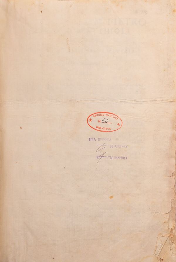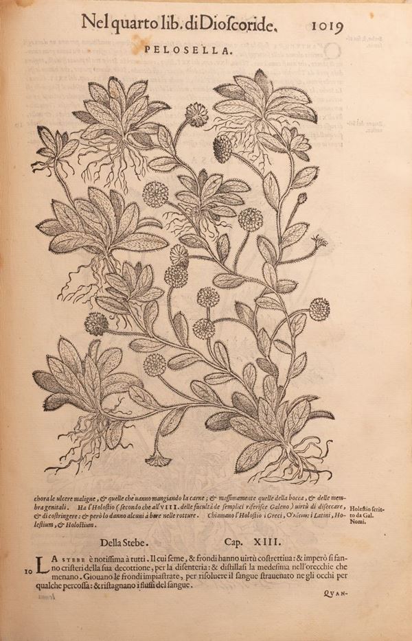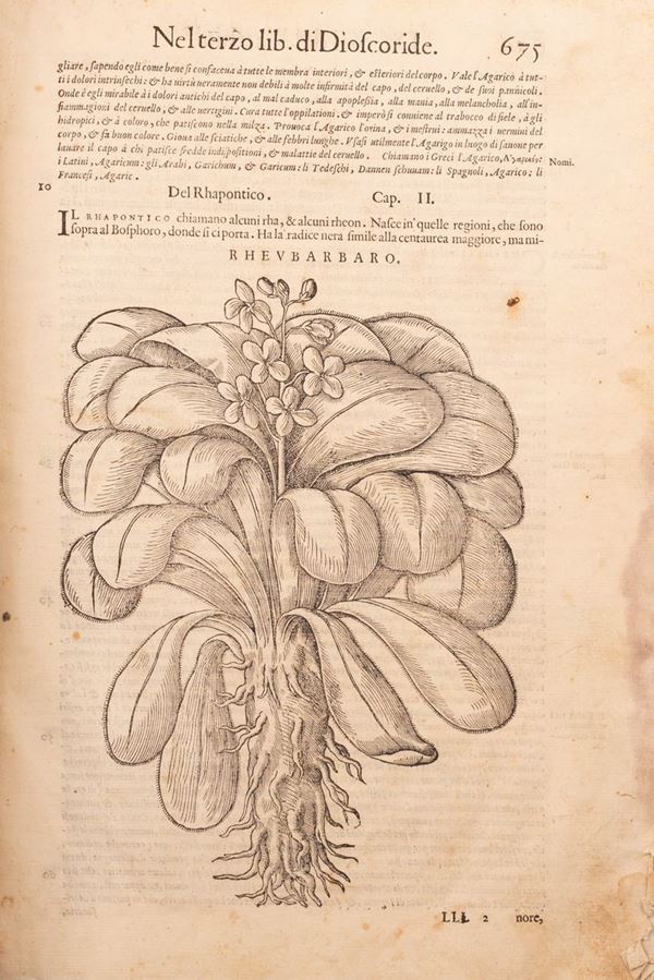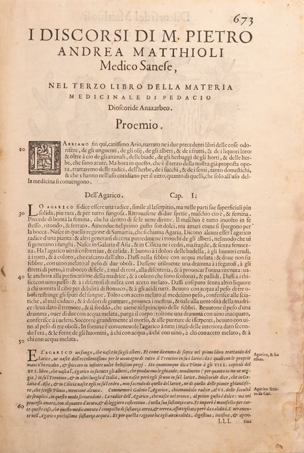 1 volume in-folio (mm 320x220). Pagine [154], 1 carta bianca, 843, [1]. Senza l'appendice di 8 pagine con Del modo di distillare le acque da tutte le piante. Moltissime illustrazioni nel testo. Marca tipografica incisa in legno al frontespizio e ripetuta più piccola in fine. Frontespizio controfondato, le prime 80 carte con minimi restauri e velinature sui bordi, oltre a margini impercettibilmente più corti, qualche altro restauro e difetto sparso ma nel complesso buona copia. Legatura moderna in mezza pelle con piatti rivestiti in carta xilografata, lisa. Nota di possesso manoscritta al frontespizio oltre a due timbri di collezione privata.