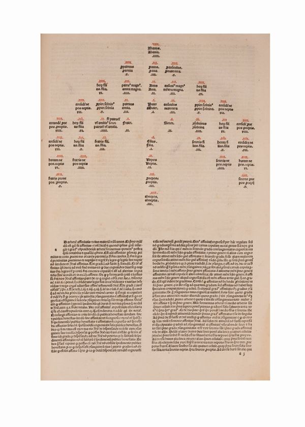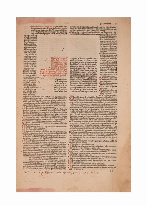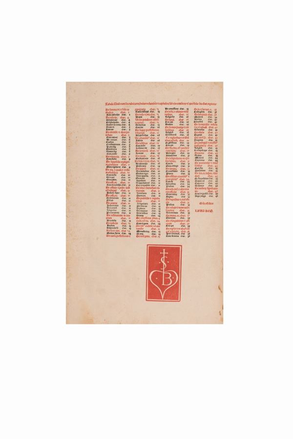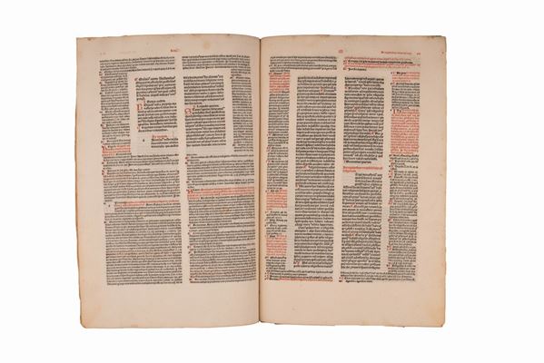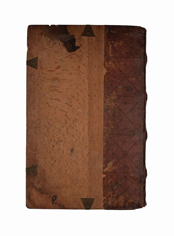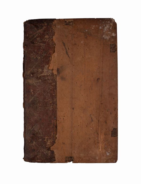 Impressum venetgo per Bernardinù de tridino de monteferrato in Anno Domini 1491 Die wig Marty " Due Volumi in folio (cm 44x28) con testo su due colonne in inchiostro nero e rosso. Legatura in pelle sui dorsi e in parte dei piatti con motivi geometrici a losanga e fregi incisi. Tasselli triangolari in ferro sui lati dei piatti, in alcune parti mancanti, un tempo provvisti di legatura in ferro. Fori di tarlo nel testo, diverse pagine centrali asportate, macchie di umidità. Recente restauro al piatto di uno dei volumi.