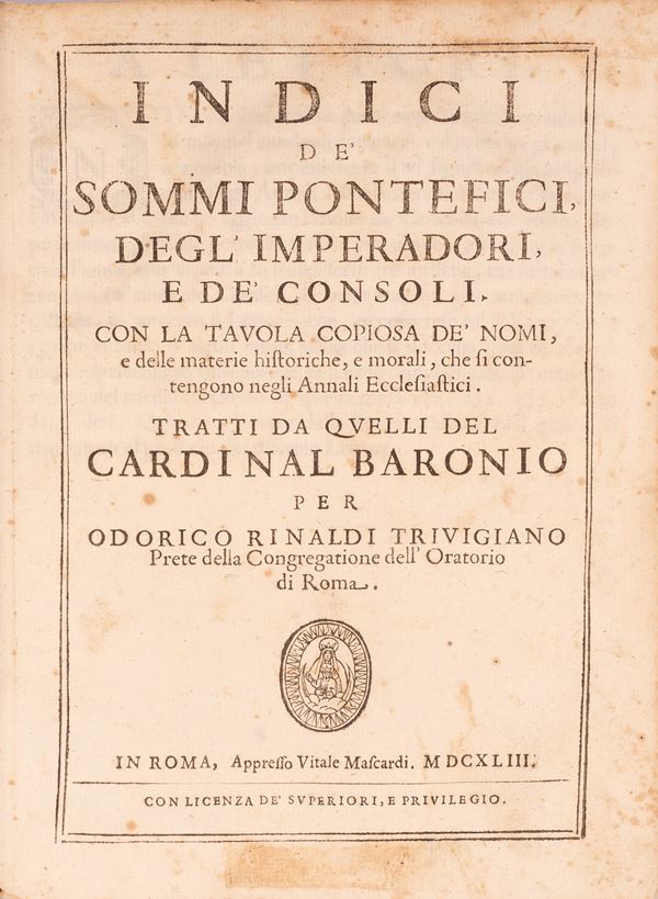 In 4°, bellissimo cartonato con tassello al dorso, xilografia di una Madonna col bambino al frontespizio, due graziose xilografie ornamentali aprono e chiudono il testo, qualche arrossamento di pagine, vecchia traccia leggera di gora alla fine delle pagine del testo, testo scritto su tre colonne, 6 pagine non numerate, frontespizio, 2 carte bianche, pagine numerate 898. Indici dè sommi Pontefici degl'Imperadori e dè Consoli. Colla tavola copiosa dè nomi e delle materie storiali e morali che si contengono negli Annali Ecclesiastici tratti da quelli del Cardinal Baronio per Odorico Rinaldi Trivigiano - prete della Congregatione dell'Oratorio di Roma.