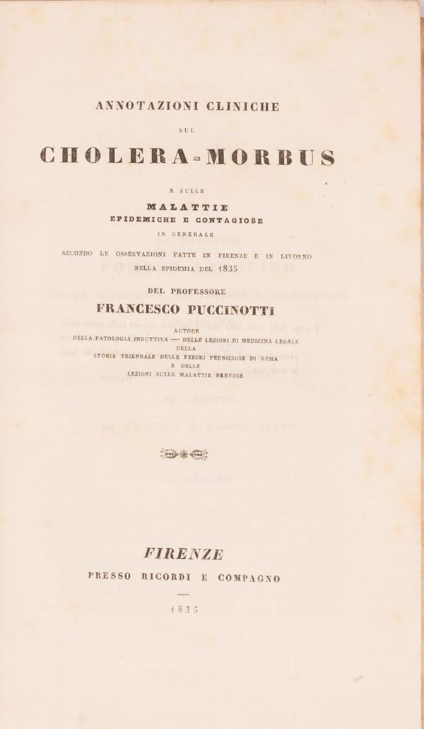n) Annotazioni cliniche sul Cholera-Morbus e sulle malattie epidemiche e contagiose in generale secondo le osservazioni fatte in Firenze e in Livorno nella epidemia del 1835 del Prof. Francesco Puccinotti. Firenze. Presso Ricordi e Compagno. 1835;