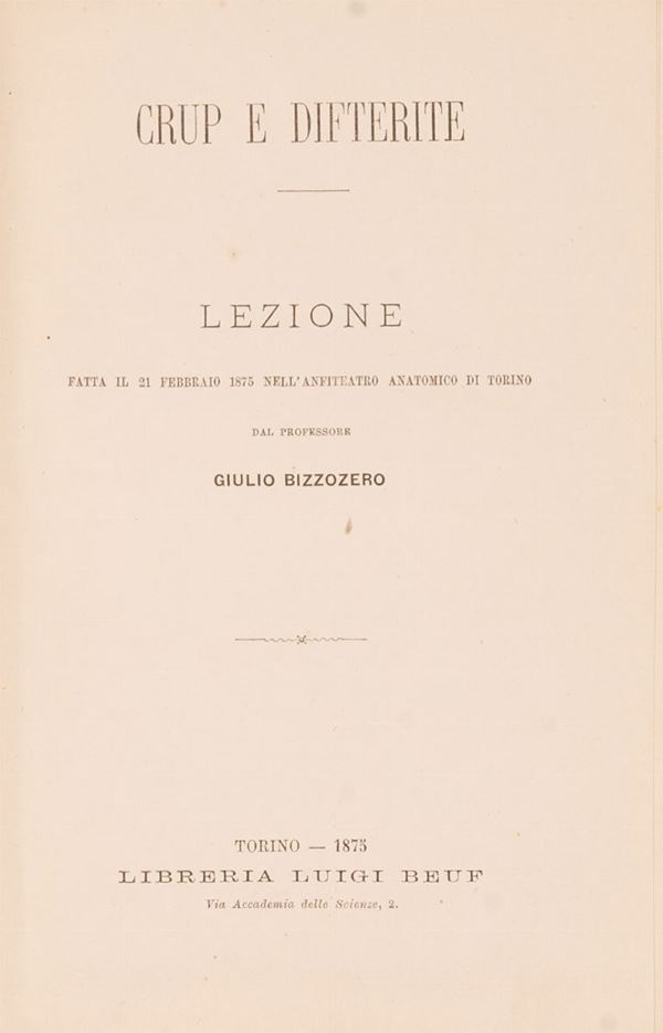 m) Crup e differite. Lezione fatta il 21 febbraio 1875 nell'Anfiteatro Anantomico di Torino dal Prof. Giulio Bizzozero. Torino 1873. Libreria Luigi Beuf;
