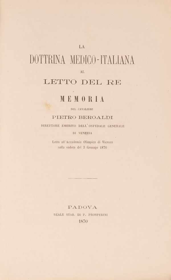 i) La dottrina medico italiana al letto del Re. Memoria del Cavaliere Pietro Beroaldi direttore emerito dell'Ospedale Generale di Venezia letta all'Accademia Olimpica di Vicenza nella sduta del 3 gennajo 1870. Padova Reale Stab. di P. Prosperini, 1870;
