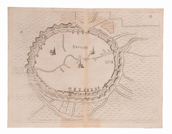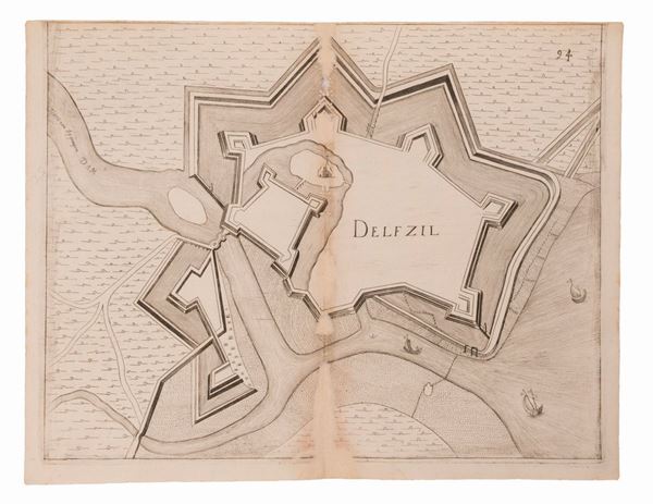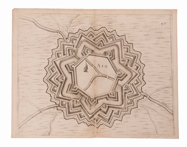 cm 44x34Lotto di 27 incisioni ( di 120 originarie) all'acquaforte di mappe (che erano a doppia pagina nel volume) raffiguranti le piante e le fortezze delle città delle Province Unite del Belgio