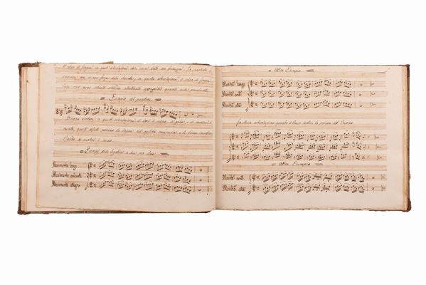 Manoscritto illustrato con disegni e arricchito da spartiti musicali