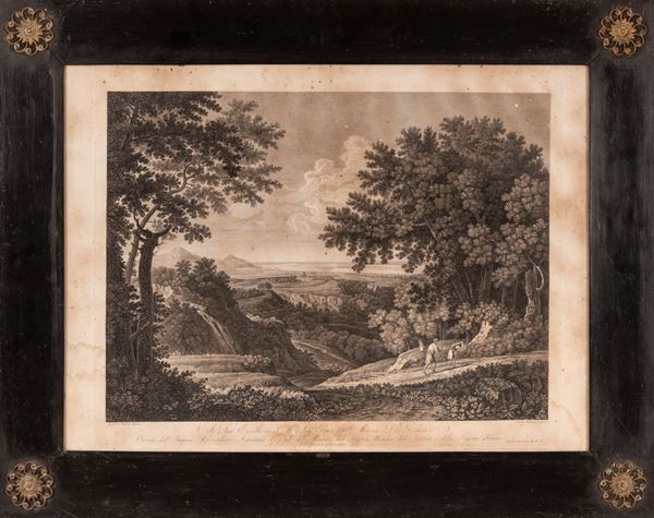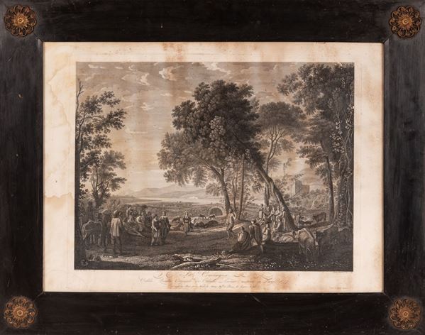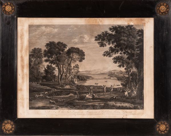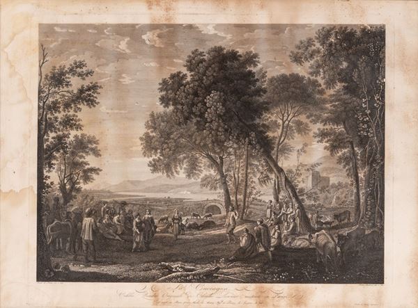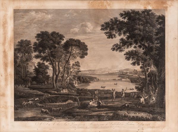 Incisione originale all'acquaforte da un soggetto di Claude de Lorrain (Chamagne 1600 – Roma 1682), stampata, pubblicata e venduta a Roma dall'editore e mercante di stampe Nicola de Antoni nel suo negozio di Piazza di Spagna all'inizio del XIXº secolo.