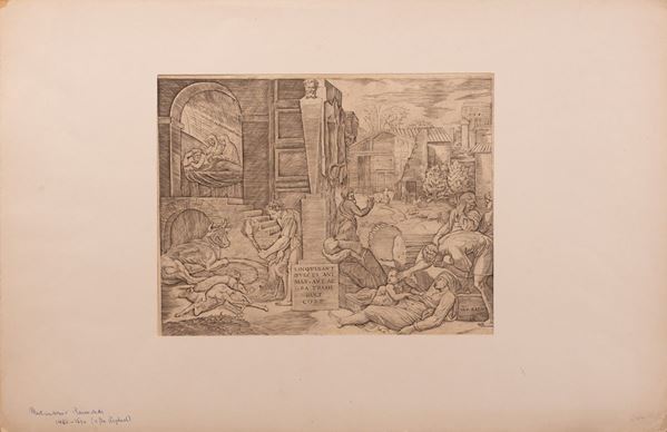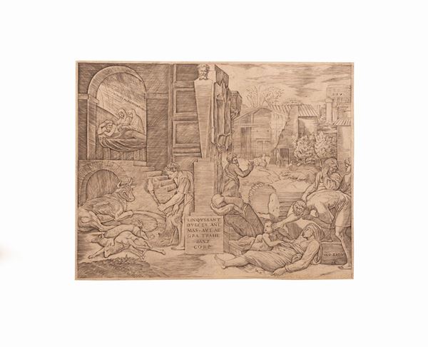 mm 254x199In questa immagine Raimondi riproduce un disegno di Raffaello, probabilmente creato per essere inciso. Il tema che ha ispirato il disegno è stato tratto dall'Eneide di Virgilio, in particolare dal Libro III, che descrive un'epidemia di peste che colpì il gruppo di profughi troiani quando sbarcarono e si stabilirono nell'isola di Creta. Gli sforzi dei Troiani per prevenire la diffusione dell'epidemia non hanno successo e molte persone e animali muoiono a causa del devastante attacco della peste.