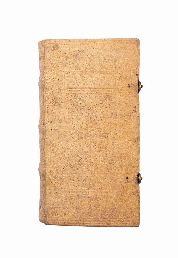 DESCRIZIONE:In-12° (mm 150x75). Pagine [52], 380, [32]. Antiporta figurata incisa in rame, un poco rifilata al margine destro e marca xilografica al frontespizio. Finalini e capilettera incisi in legno. Ottimo esemplare in piena pergamena rigida con decorazioni impresse ai piatti, lacci di chiusura in metallo, tagli spruzzati e dorso a 3 nervi. Nota di possesso in parte cancellata al frontespizio.