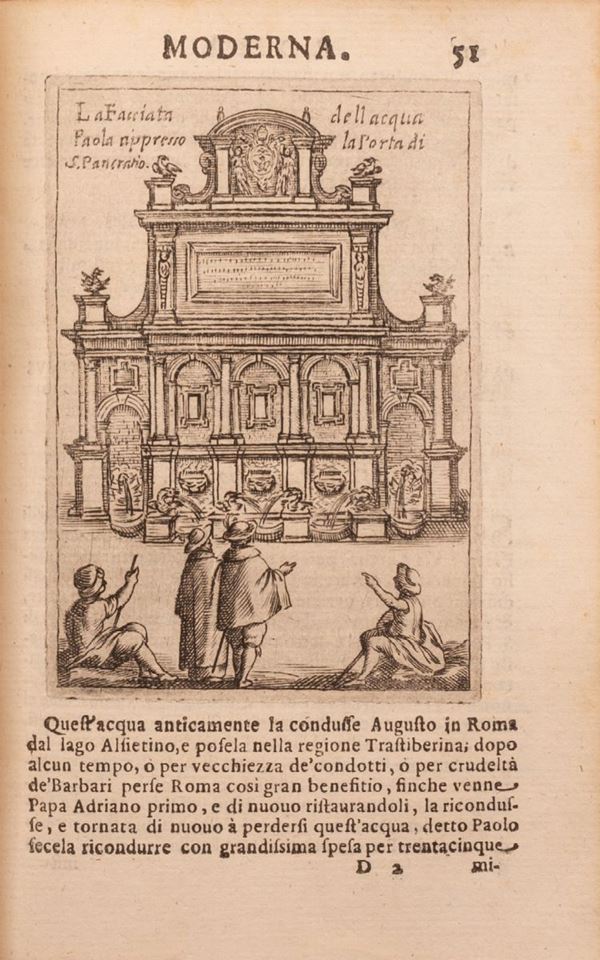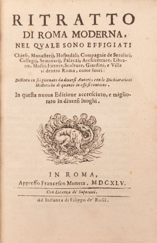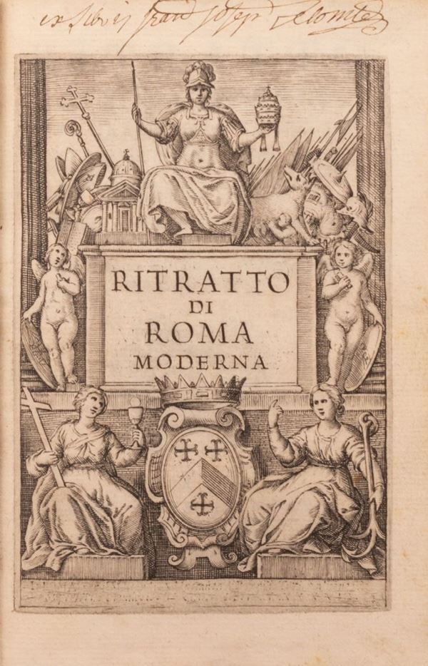 DESCRIZIONE: 8vo (cm. 16,3), 14 cc.nn. (compreso frontespizio allegorico interamente inciso), 532 pp. 83 incisioni contate di monumenti, ville e zone di Roma. 71 incisioni di medaglie ben dettagliate pubblicate su bella carta fresca. Macchia scura e segni di usura sulla copertina anteriore. Gora di acqua marginale su una trentina di pagine Marca tipografica al colophon. Legatura coeva in piena pelle con nervi e cornici impresse a secco ai piatti. Ottimo, freschissimo esemplare. Prima edizione, molto rara, di una delle più belle guide seicentesche su Roma moderna.