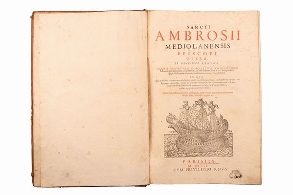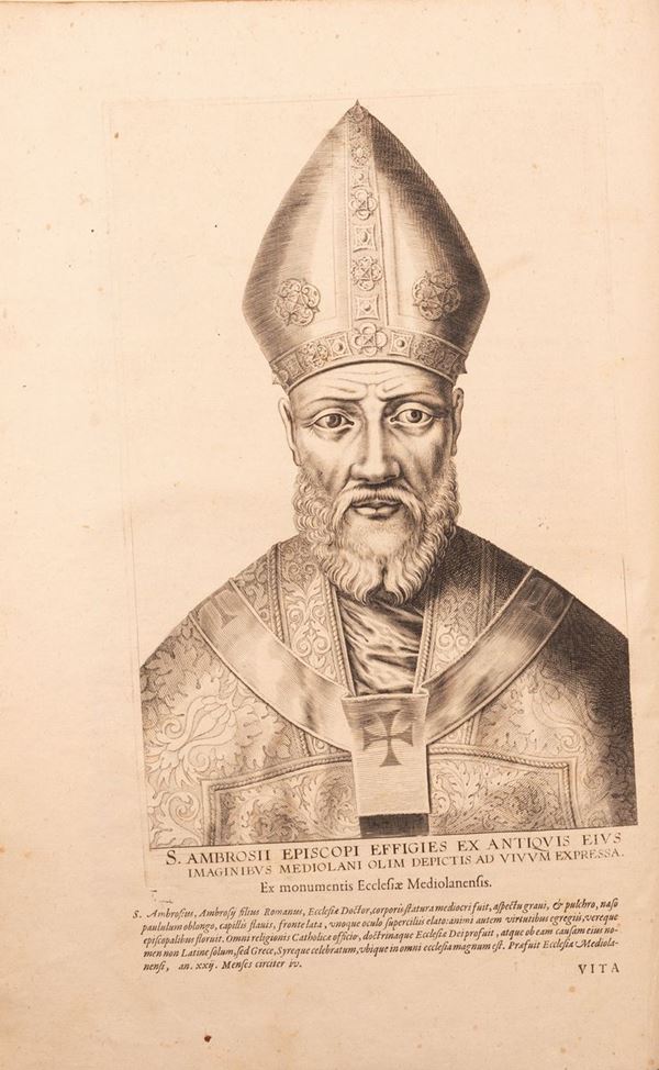 3 volumi in un unico tomo rilegato. Antiporta con incisione che ritrae Sant' Ambrogio, bella marca tipografica al frontespizio con stampa a in rosso e nero, capilettera incisi, letetre dedicatorie, testo su due colonne, la numerazione delle pagine é assente in quanto sono numerate le colonne. Coperte con evidente usura e legatura parzialmente distaccata.