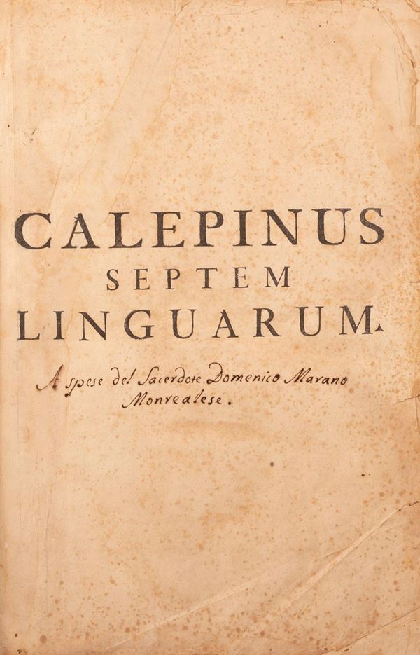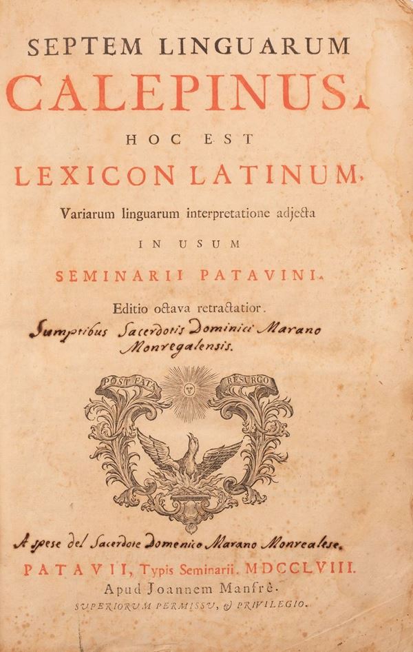 Foglio grande, 2 voll. (1a v.: fronte, 2 h., 464 p.; 2a v.: fronte, 481 p., 86 p.). Stampato in doppia colonna. Pergamena, lettere dipinte al dorso. Ex libris. Buona copia. Dizionario molto prezioso, apparso per la prima volta in latino, ma ampiamente ristampato, e in ogni edizione si aggiungeva una nuova lingua, fino a raggiungere sette o otto, tra le quali compare sempre il castigliano. Questa ottava edizione è una ristampa ritoccata della settima. Alla fine del secondo volume compare, in 86 pagine di propria numerazione, il supplemento: "Verba barbara, ex Calepini, Passeratii, Stephani & Fabri Lexicis expulsa". Palau cita questa edizione, senza descriverla (40373). Graesse descrive la settima edizione del 1752, e cita anche questa ottava, del 1758 (Graesse, II, 15). Brunet descrive anche la settima (B., I, p. 1474). Lingua latina. Dizionari. Lingua latina. Dizionari.
