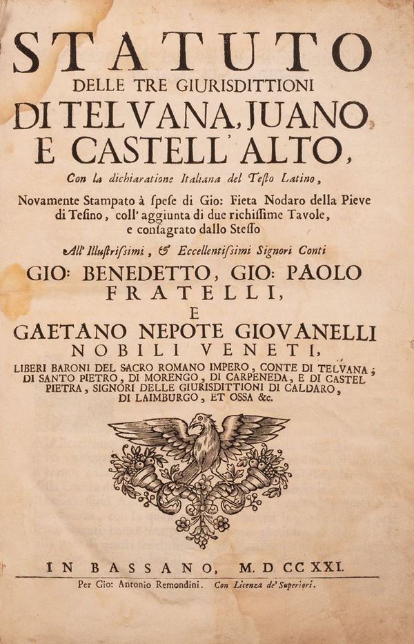 STATUTO DELLE TRE GIURISDITTIONI DI TELVANA, JUANO, E CASTELL'ALTO, CON LA DICHIARATIONE ITALIANA DEL TESTO LATINO. NOVAMENTE STAMPATO A SPESE DI GIO. FIETA NODARO DELLA PIEVE DI TESINO, COLL'AGGIUNTA DI DUE RICHISSIME TAVOLE CONSAGRATO DALLO STESSO ALL'ILLUSTRISSIMI & ECCELLENTISSIMI CONTI GIO. BENEDETTO, GIO. PAOLO FRATELLI E GAETANO NEPOTE GIOVANELLI NOBILI VENETI(...) 1721 PER GIO. ANTONIO REMONDINI, IN BASSANO