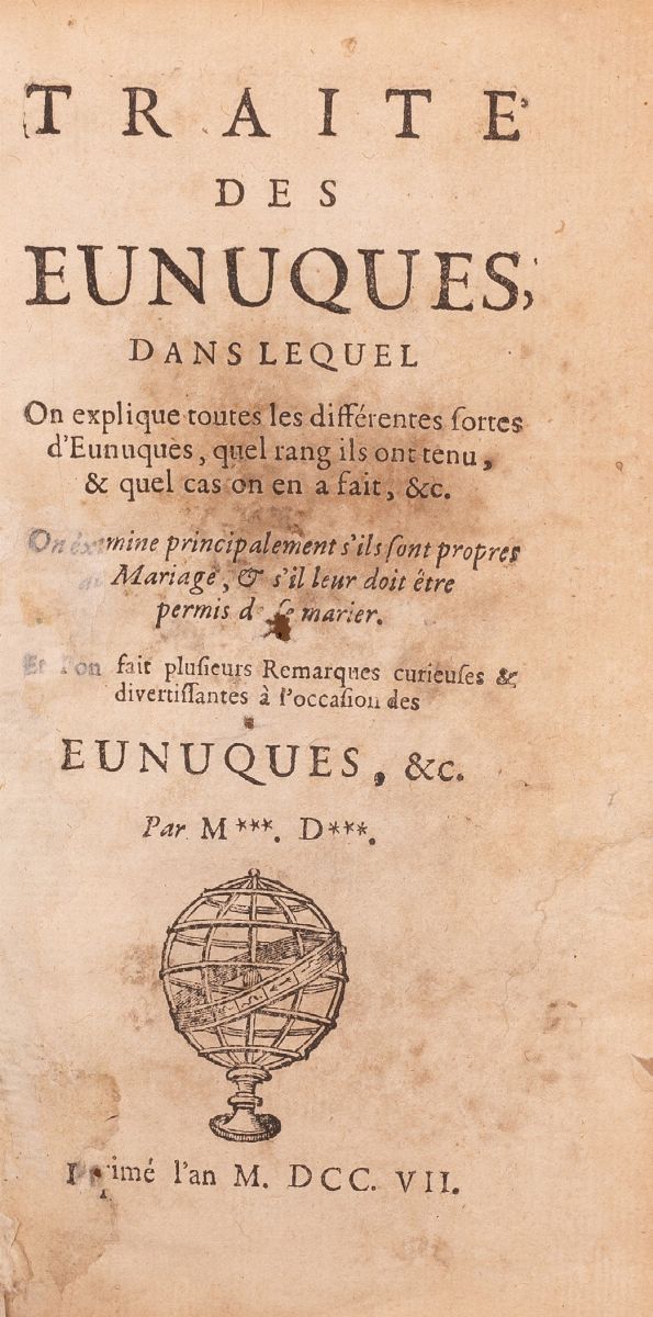 Traité des Eunuques, dans lequel on explique toutes les différentes sortes d’Eunuques, quel rang il ont tenu, & dans quel cas on en a fait, &c. On éxamine principalement s’ils sont propres au Mariage, & s’il leur doit être permis de se marier. Et l’on fait plusieurs Remarques curieuses & divertissantes à l’occasion des Eunuques, &c. Par M***. D***.