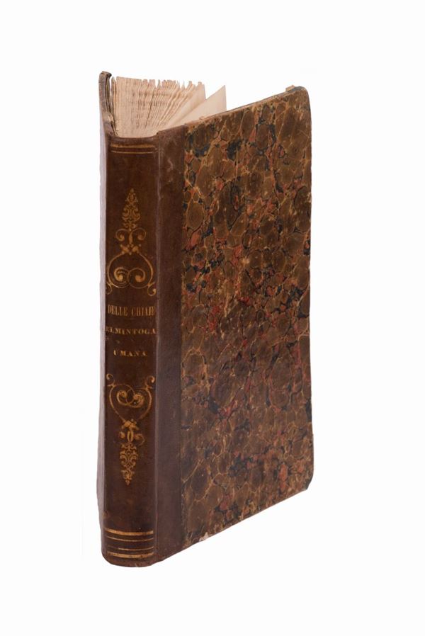 m.21,8x14,2. Pg.XL, 352. Legatura in mz.pelle marrone con titoli e fregi in oro al dorso. Piatti marmorizzati. Frontespizio decorato con due piccoli medaglioni incisi raffiguranti Ippocrate e Francesco Redi, indicati come "Fondatori della Elmintografia". Con 16 tavole litografiche fuori testo.