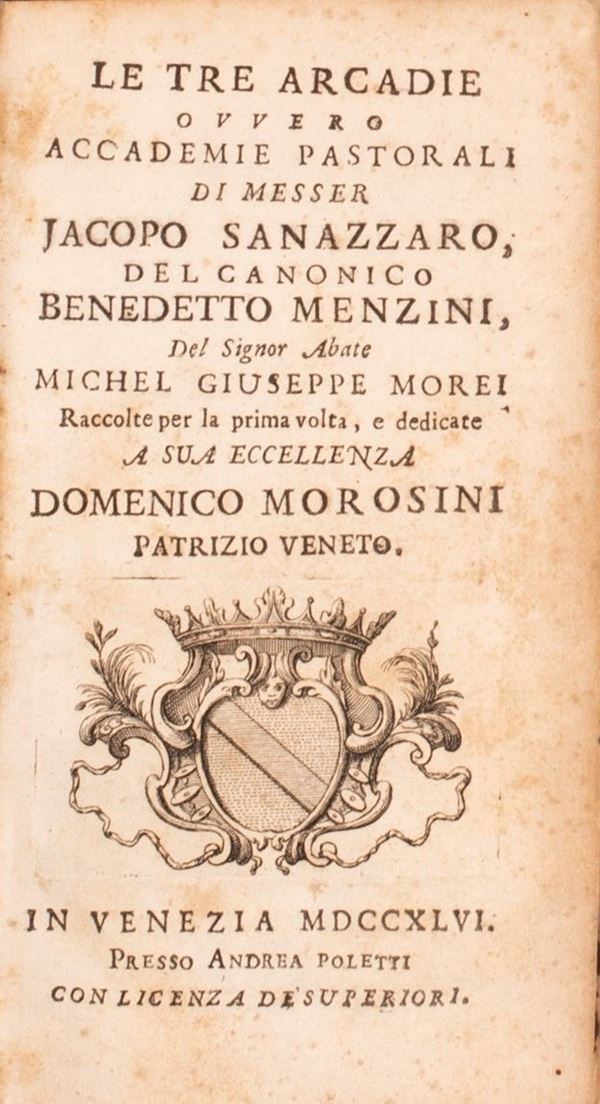 Le Tre Arcadie ovvero Accademie Pastorali di Messer Jacopo Sanazzaro, del canonico Benedetto Menzini del sig. abate Michel Giuseppe Morei raccolte per la prima volta e dedicate a sua eccellenza Domenico Morosini patrizio veneto. In Venezia 1746 presso Andrea Poletti con licenza de' superiori. Volume in piena pelle, in 16esimo, titolo in oro sul dorso