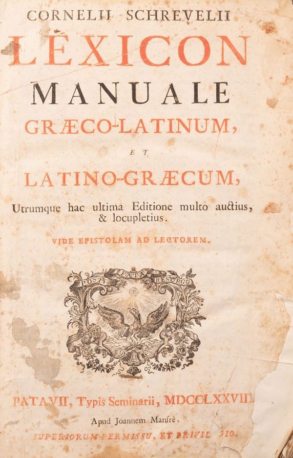 LEXICON MANUALE GRAECO-LATINUM ET LATINO-GRAECUM , Patavii, Typis Seminarii, 1778 Apud Joannem Manfrè , mezza pelle, in quarto. restauto antico al frontespizio. mancanze ai piatti anteriore e posteriore, difetti al dorso