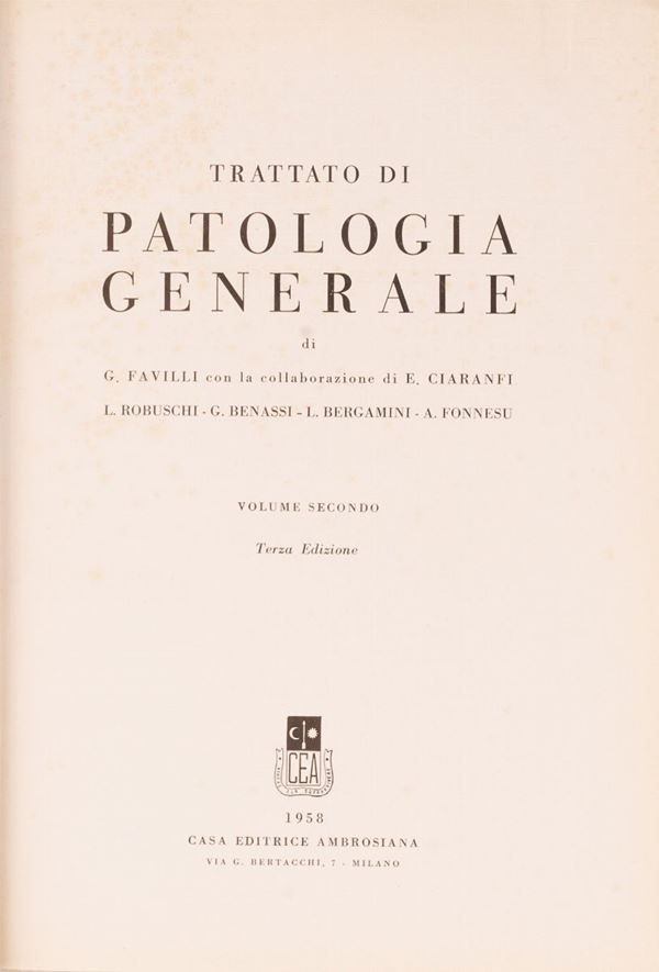 a) Favilli G. e Collaboratori. Trattato di Patologia Generale III Edizione . Milano, 1958. due volumi in edizione telata. dedica autografa dell'autore. pgg. XXXII- 1876con 501 fgg;