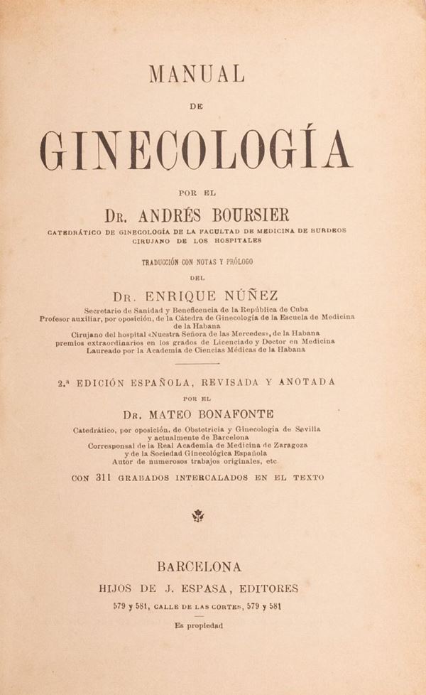 Manual de ginecologia por el dr. Andres Bousier Barcelona Hijos de J. Espasa editores