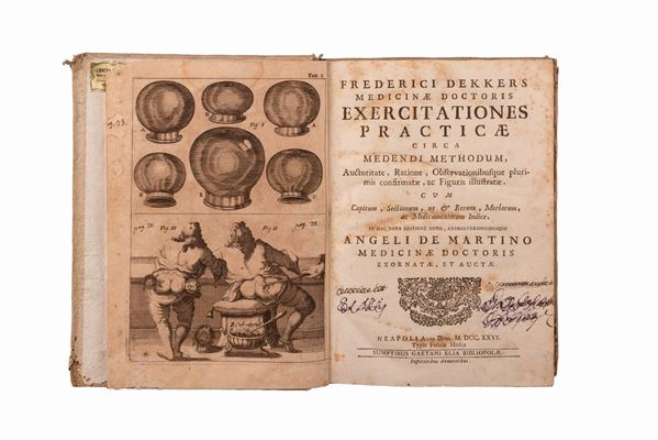 Frederici Dekkers medicinae doctoris exercitationes practicae circa medendi methodum, auctoritate, ratione, observationibusque plurimis confirmatae, ac figuris illustratae. Cum capitum, sectionum, ut et rerum, morborum, ac medicamentorum indice. In hac nova editione notis, animadversionibusque Angeli De Martino medicinae doctoris exornatae, et auctae. Neapoli Typis Felicis Mosca sumptibus Gaetani Elia bibliopolae. 1726.