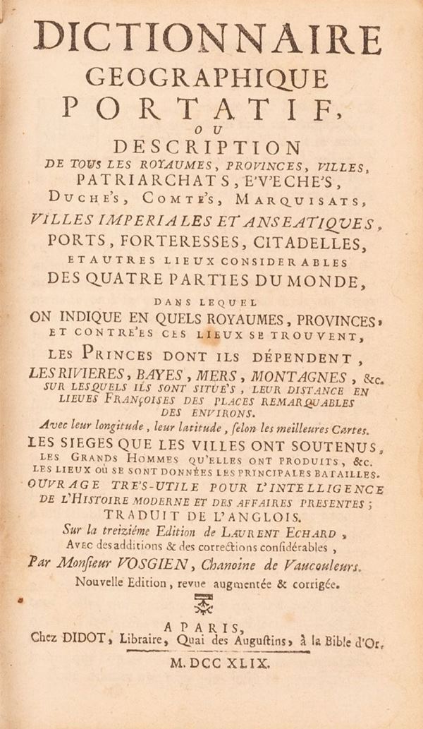 Dictionnaire géographique portatif, ou, Description de tous les royaumes, provinces, villes, patriarchats, evéchés, duchés, comtés, marguisats, villes impériales et anséatiques, ports, forteresses, citadelles, et autres lieux considerables des quatre parties du monde (...) Paris, chez Didot, 1749 1 volume in piena pelle con nervi, fregi in oro, titolo in testatina rossa, segni di usura sui piatti. qualche lieve macchia di foxing all'interno.