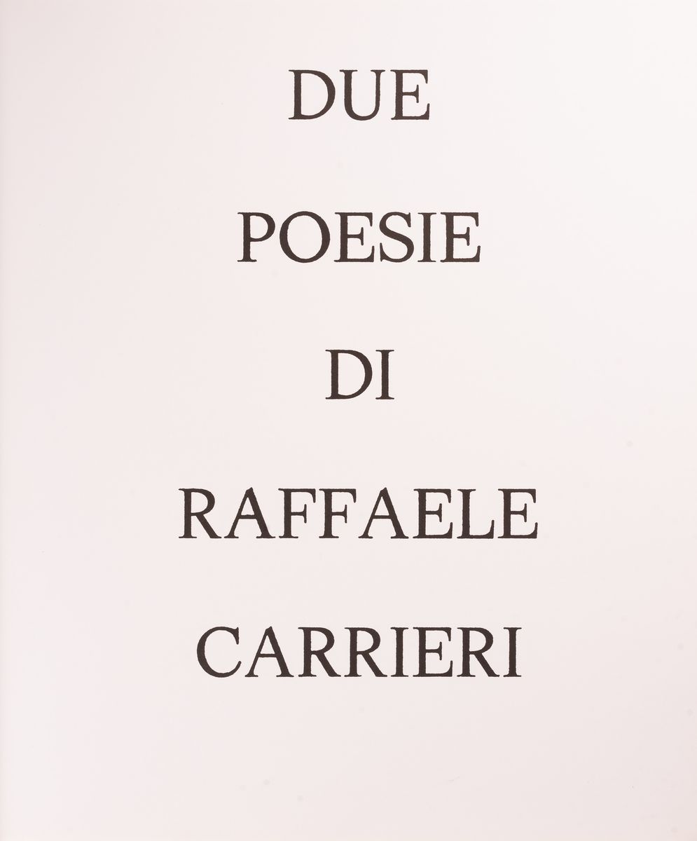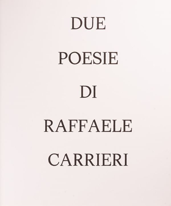 La cartella contiene 2 poesie di Raffaele Carrieri, rilegate assieme a 2 acqueforti di Arturo Carmassi.