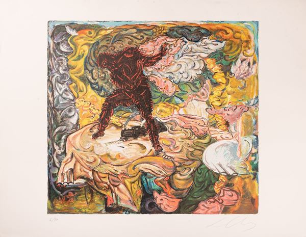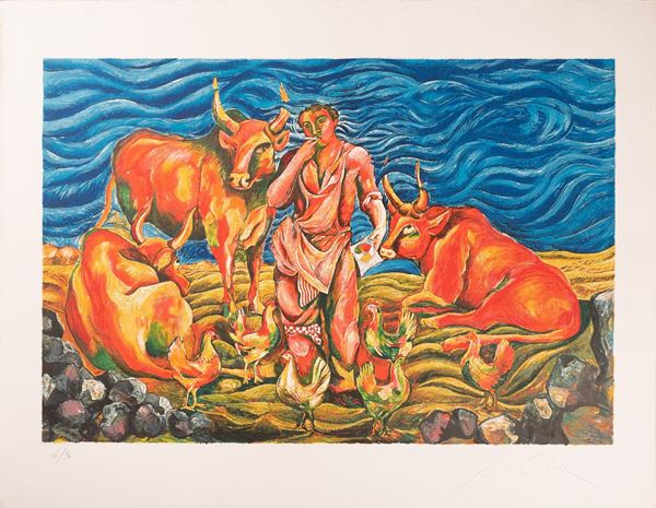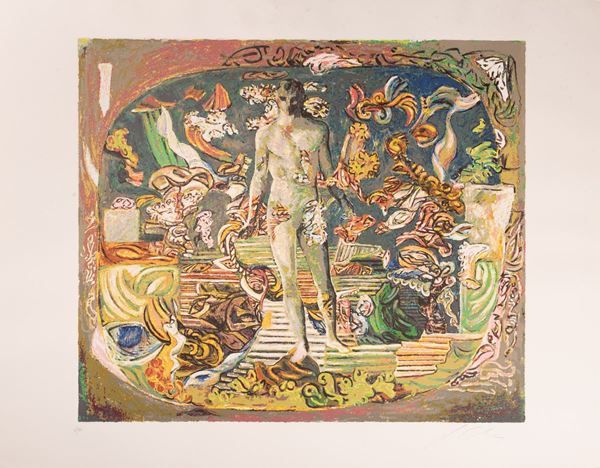 Le 3 litografie sono una a 32, una a 25 e una a 29 colori e portano i seguenti titoli: Oggetti che salgonoPastorale Strano passo. Cartella in piena tela rossa a 3 lembi con legacci in stoffa e titolo, autore e dati editoriali impressi al piatto anteriore. Edizioni Galleria Bagnai, Siena, 1993. Es. 10/90. Provenienza: Collezione Luciano Catarzi.