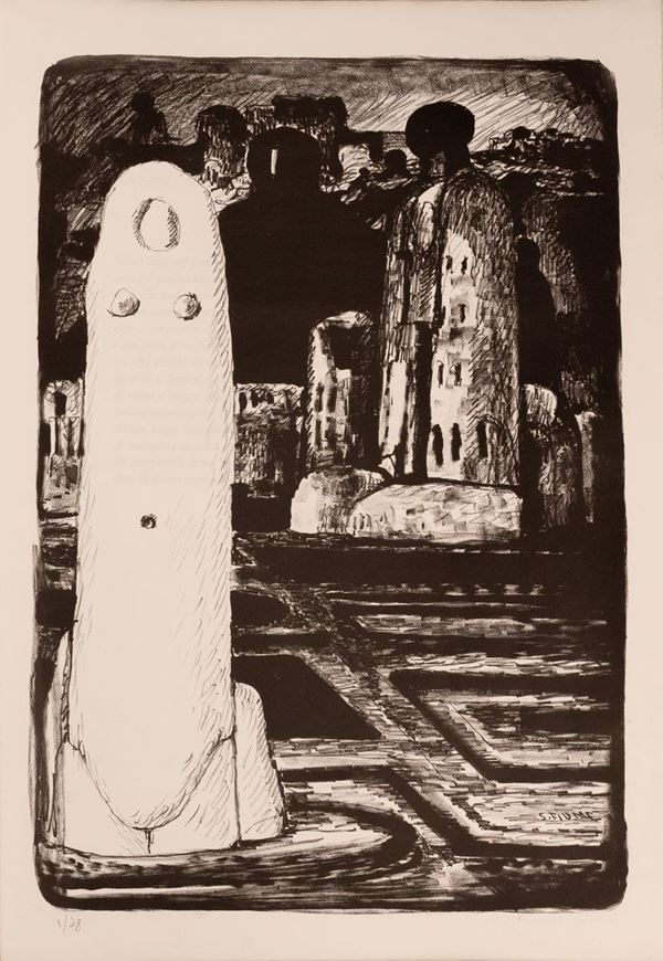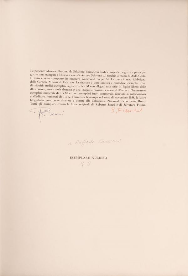 Edizione illustrata da Salvatore Fiume con 13 itografie originali a piena pagina. Stampata a Milano a cura di Arturo Schwarz sul torchio a mano di Aldo Costa. Il testo è stato composto in carattere Garamond corpo 24. La carta è stata fabbricata dalle Cartiere Miliani di Fabriano. La tiratura è stata limitata a centodieci eemplari così distribuiti: tredici esemplari segnati da A a M con allegato una serie in foglio libro delle illustrazioni, una tavola sbarrata e una litografia colorata a mano dell'artista. Ottantasette esemplari numerati da 1 a 87 e dieci esemplari fuori commercio riservati ai collaboratori e all'editore, numerati da I a X. Terminata la stampa nel mese di novembre 1958, le lastre litografiche sono state sbarrate e donate alla Calcografia Nazionale dello Stato, Roma. Tutti gli esemplari recano le firme originali di Roberto Sanesi e Salvatore Fiume.