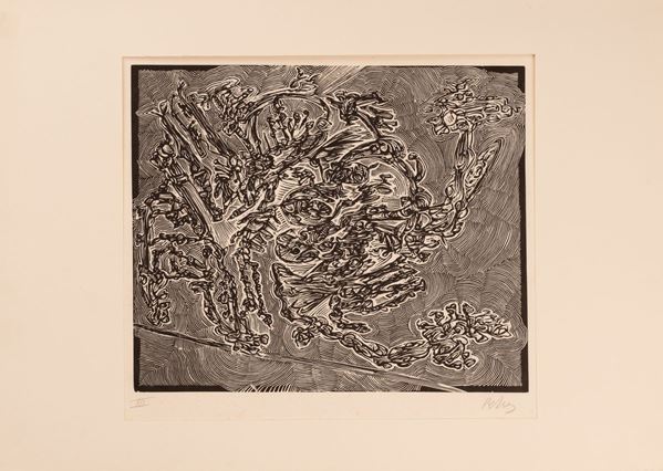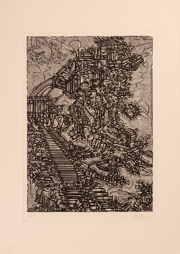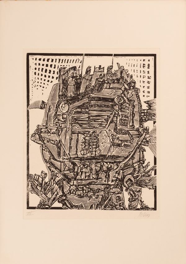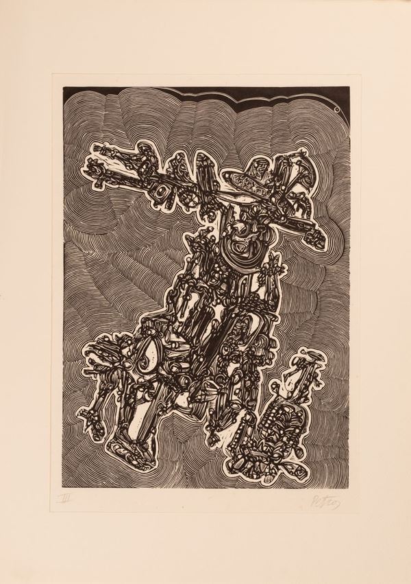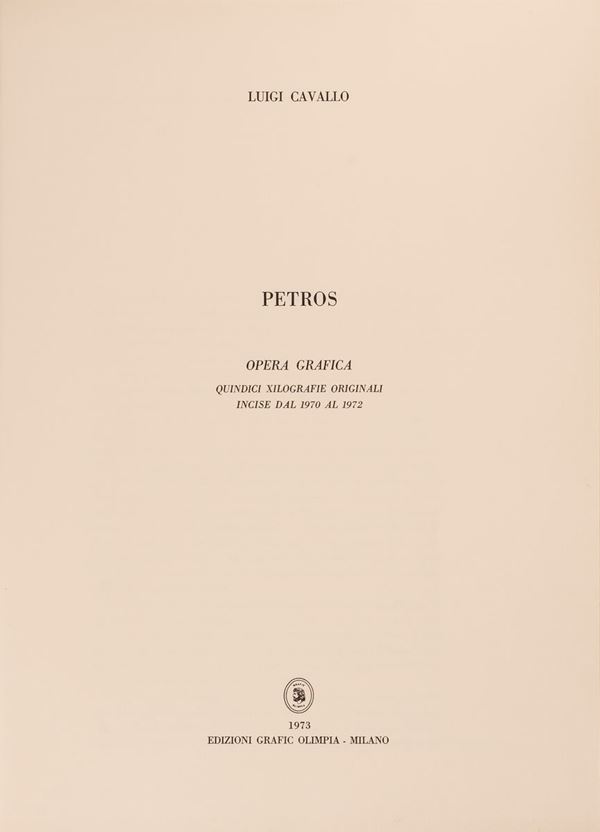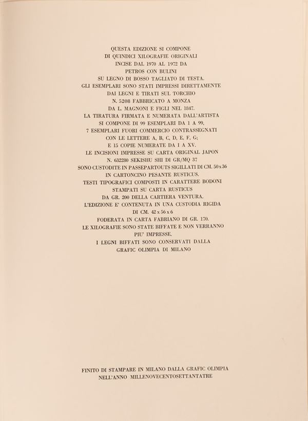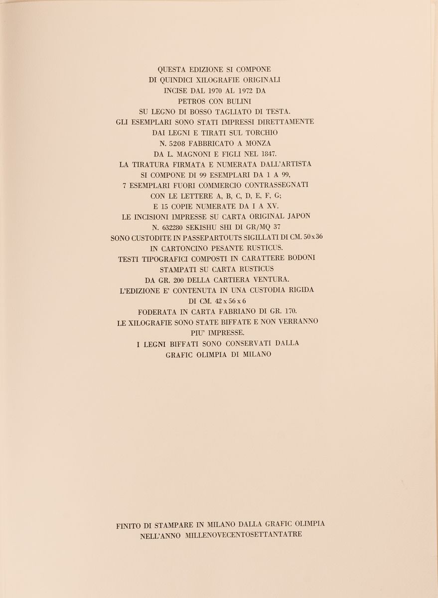 cm 49x34Cartella composta da testo di presentazione di Luigi Cavallo e 15 xilografie originali, eseguite tra il 1970 e il 1972, di Petros, ciascuna recante firma e numerazione (Esemplare III) a matita al fronte