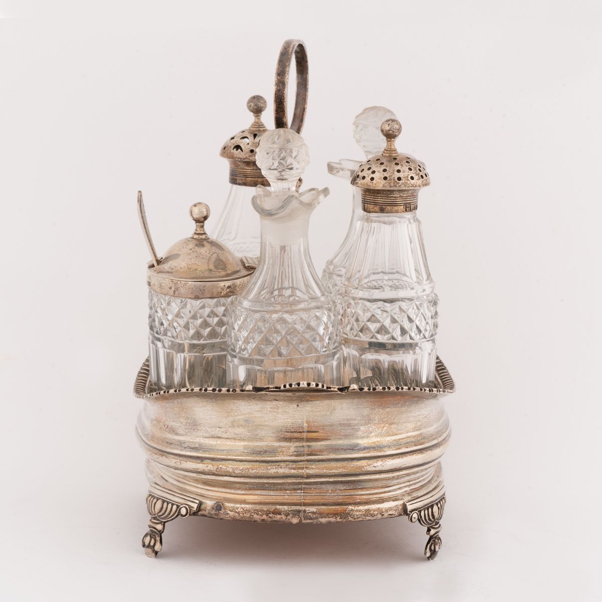 Composto da ampolline in cristallo per olio, aceto, sale, pepe e mostardiera.