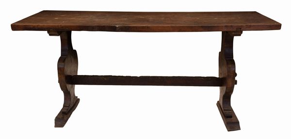 Tavolo fratino in noce con gambe ad asso di coppe. Centro Italia.