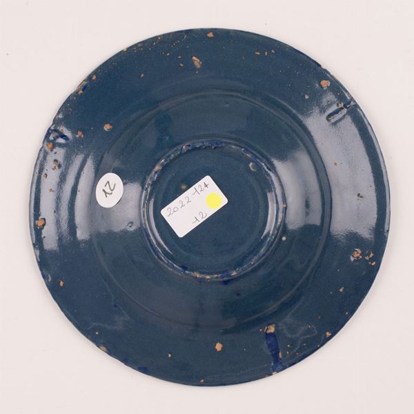 Piatto turchino in maiolica decorato in oro bianco con l'arma vescovile Farnese