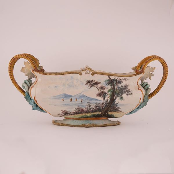 Giardiniera in maiolica decorata con elementi fitomorfi a rilievo ed istoriata con una scena agreste di gusto neo rococò
