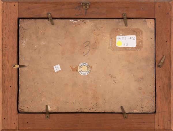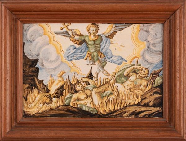 Mattonella maiolicata raffigurante San Michele Arcangelo trionfante