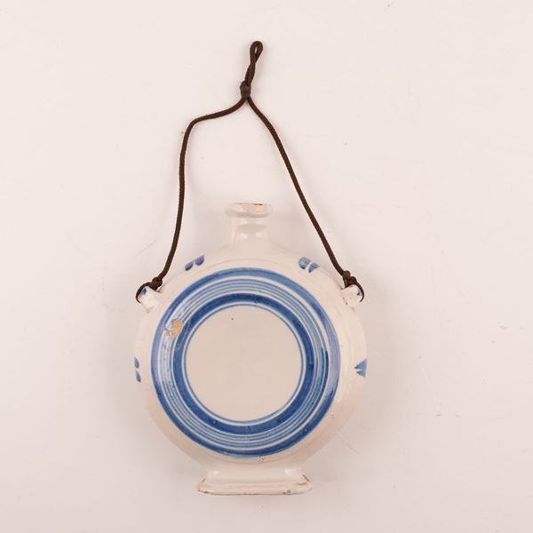 Fiaschetta in maiolica da "pellegrino" con motivi decorativi circolari realizzati in monocromia blu.