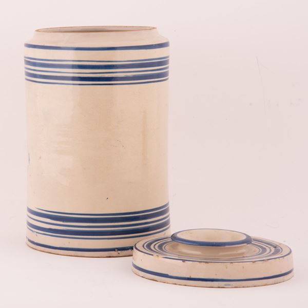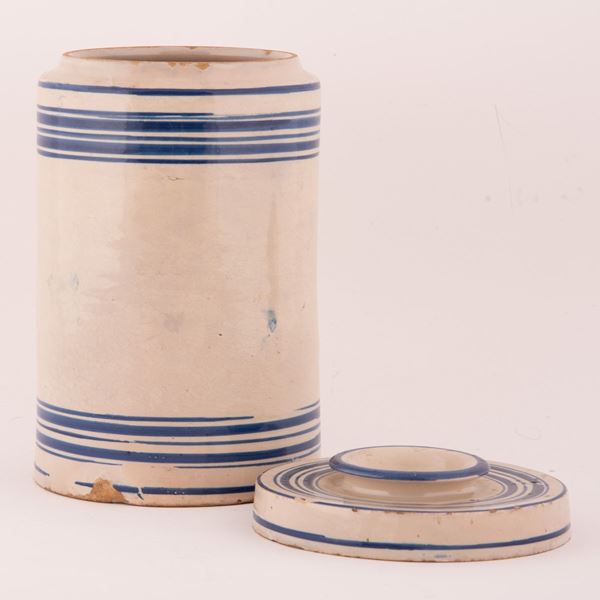 Contenitore cilindrico in maiolica decorato in monocromia blu con linee concentriche