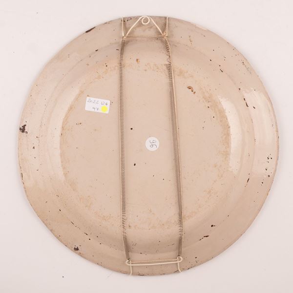 Piatto da portata in maiolica a fondo bianco decorato in policromia. Presenta al centro mazzo di fiori. Sul bordo filettatura in blu.