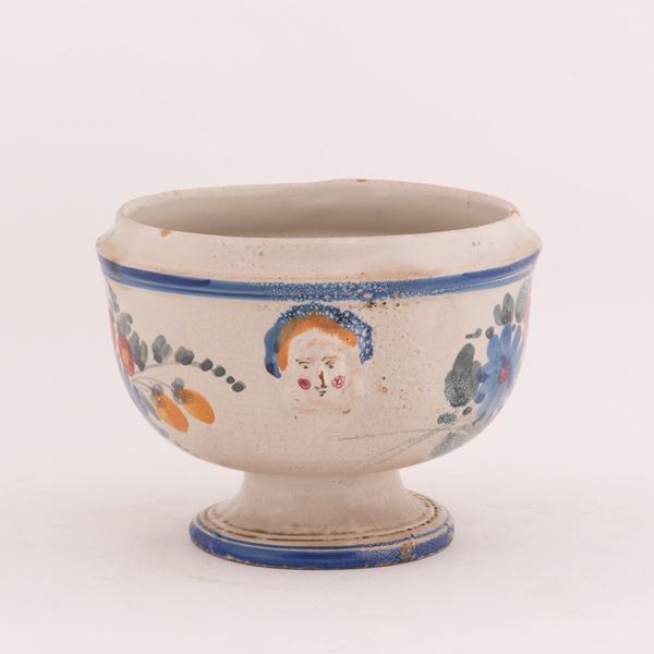 Zuppiera in maiolica decorata in policromia con motivi floreali e bordatore in blu. Ai lati mascheroni.